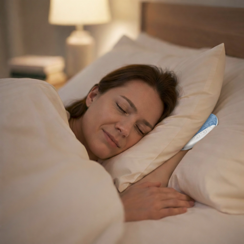 Science has known for decades that sound directly affects how fast your brain enters sleep. Listening to calm audio—rain, white noise, or soft music—slows your heart rate, lowers cortisol, and signals your nervous system to shift out of alertness and into rest. A 2021 study published in the Journal of Sleep Research found that participants who listened to calming audio before sleep fell asleep significantly faster and reported deeper, more restful nights. The problem was never the science. The problem was always the delivery. Earbuds hurt. Speakers disturb. Nothing was built to deliver that sound privately, comfortably, and all night long. That's the only thing Sleep Tone changes. And that's the only thing that needed changing. Try it tonight. Sleep better or send it back.